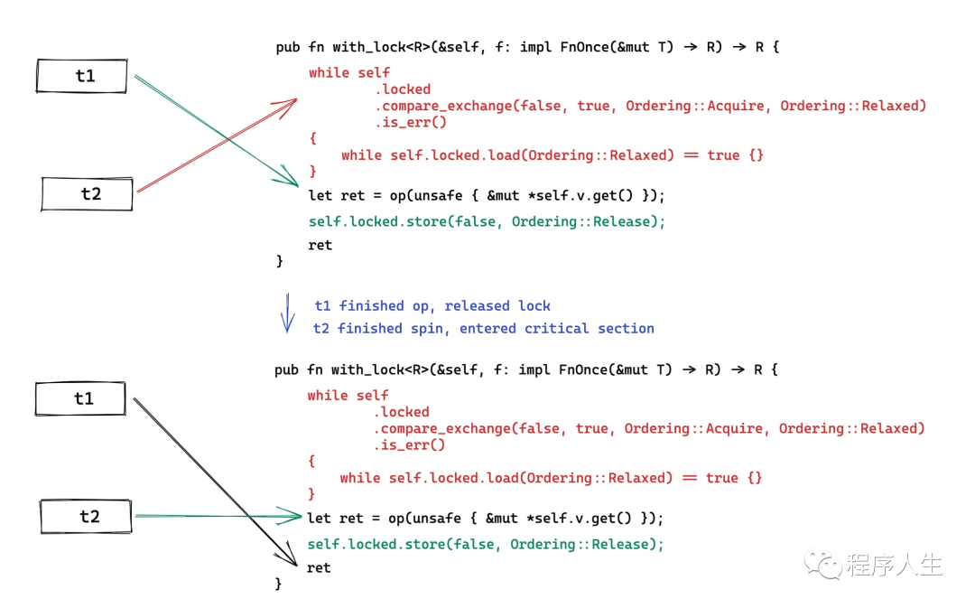 以下是两个线程同步的过程,一开始 t1 拿到锁,t2 spin,之后 t1 释放锁,t2 进入到临界区执行: